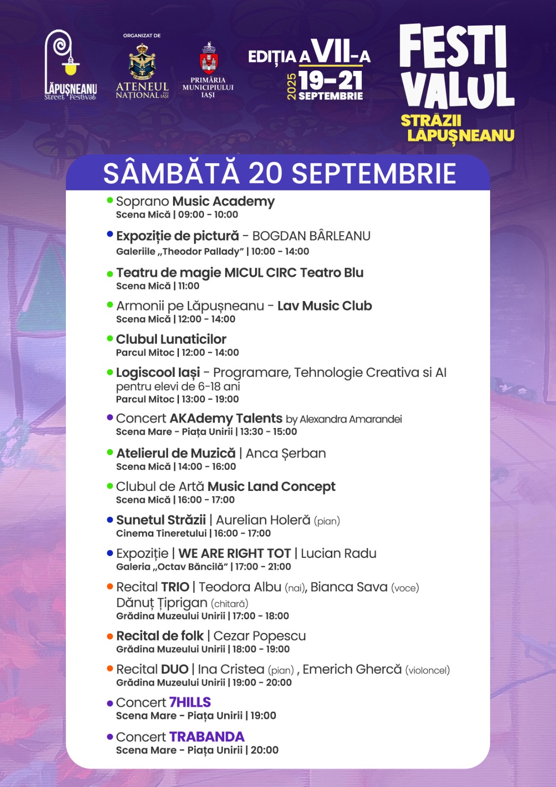 Programul muzical reunește artiști consacrați și trupe locale. În fiecare seară, Scena Mare din Piața Unirii va găzdui concerte susținute de Subcarpați, The Mono Jacks, Paul Tihan, trupa Trabanda și formația 7Hills. În Grădina Muzeului Unirii, atmosfera va fi completată de recitaluri live cu influențe folk, clasice, franceze și cross-over, în timp ce la Scena Mică din Parcul Mitoc vor urca pe scenă elevi ai mai multor școli de muzică din Iași. Un moment special va avea loc duminică, atunci când Corul de Copii al Municipiului Iași va susține un concert.