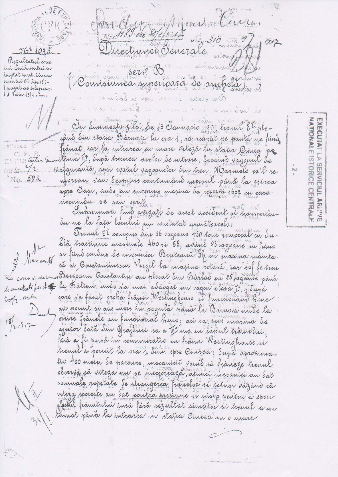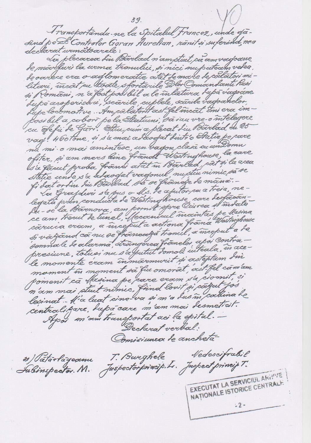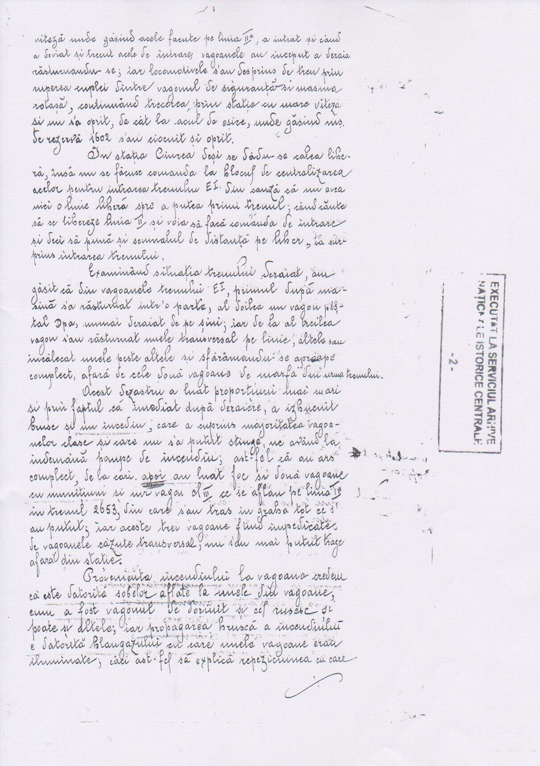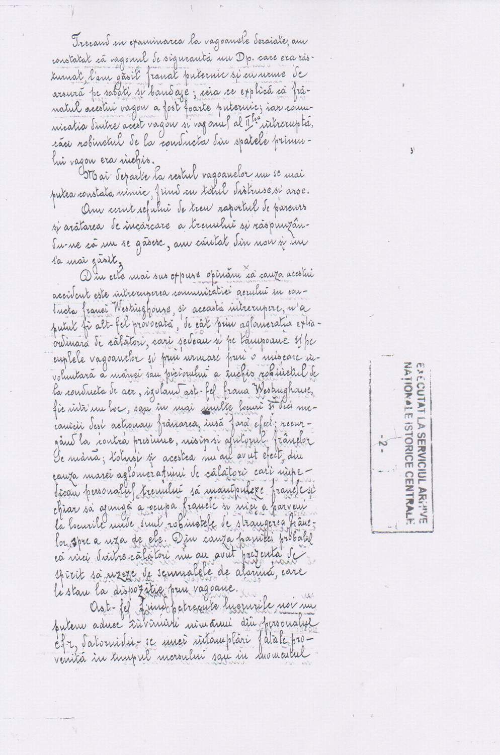 Este vorba despre un raport de cinci pagini întocmit de o comisie de anchetă a Căilor Ferate Române, un proces-verbal cu mai multe declaraţii ale personalului feroviar din tren (supravieţuitori ai accidentului), dar şi de o declaraţie a unui sublocotenent de artilerie care a avut „norocul“ să se afle în locomotivă, pentru că, după cum afirma ofiţerul, nu mai era loc în vagoane. Inginerul Leon, care ne-a pus la dispoziţie documentele, ne-a declarat că a existat şi un raport al Armatei – pentru că, deşi trenul era unul civil, în el se urcaseră mai mulţi militari: români, ruşi, chiar şi francezi.