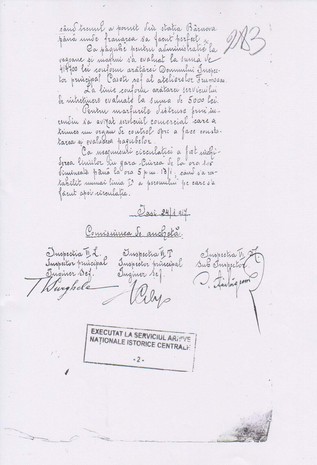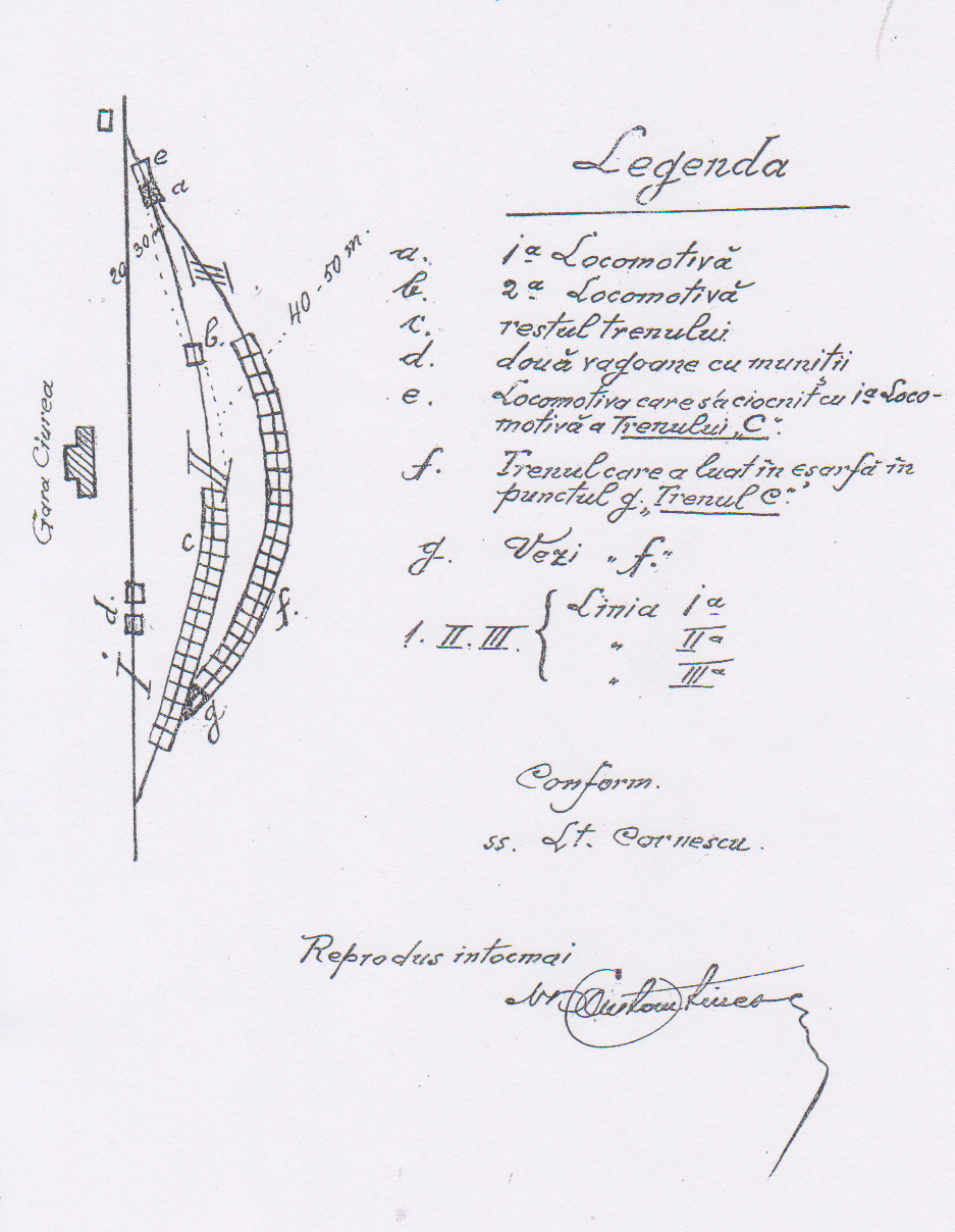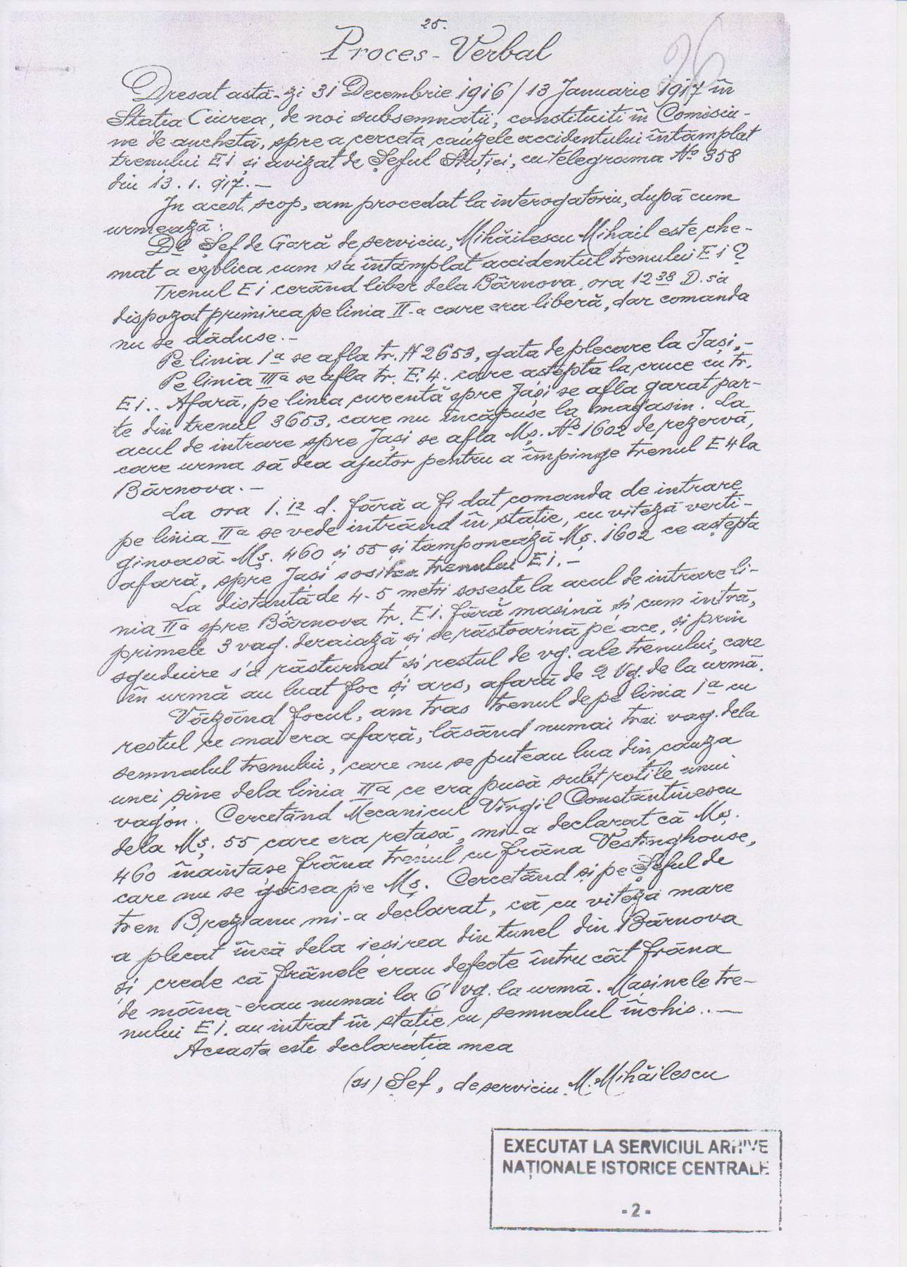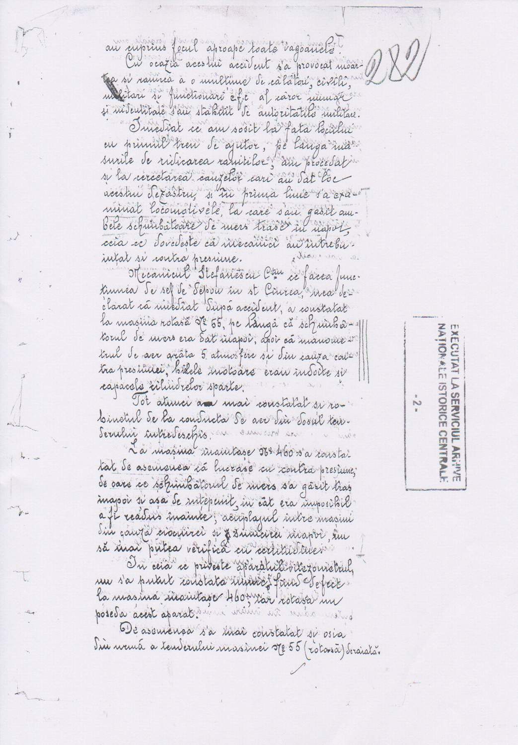 Este vorba despre un raport de cinci pagini întocmit de o comisie de anchetă a Căilor Ferate Române, un proces-verbal cu mai multe declaraţii ale personalului feroviar din tren (supravieţuitori ai accidentului), dar şi de o declaraţie a unui sublocotenent de artilerie care a avut „norocul“ să se afle în locomotivă, pentru că, după cum afirma ofiţerul, nu mai era loc în vagoane. Inginerul Leon, care ne-a pus la dispoziţie documentele, ne-a declarat că a existat şi un raport al Armatei – pentru că, deşi trenul era unul civil, în el se urcaseră mai mulţi militari: români, ruşi, chiar şi francezi.