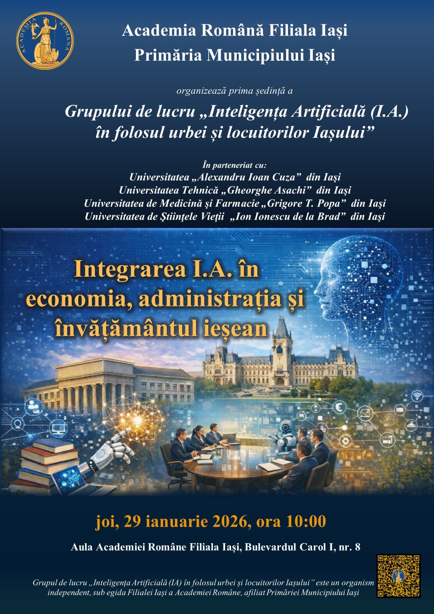Prima ședință a Grupului de lucru „Inteligența Artificială (I.A.) în folosul urbei și locuitorilor Iașului” va avea ca temă „Integrarea IA în economia, administrația și învățământul ieșean” și este programată pentru joi, 29 ianuarie 2026, începând cu ora 9:30. Evenimentul va avea loc în Aula Filialei Iași a Academiei Române.