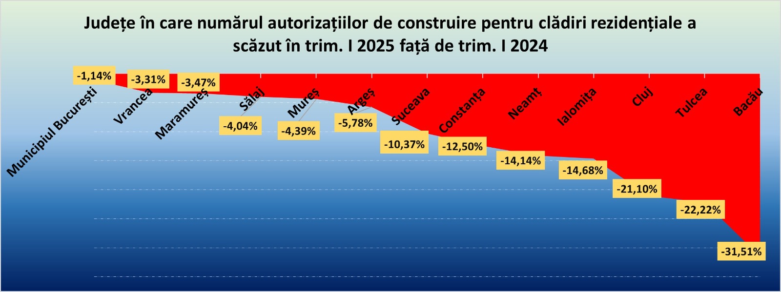 Scăderi s-au înregistrat în 13 județe (inclusiv Municipiul București), însă numai în șapte dintre acestea diminuarea numărului de autorizații pentru clădiri rezidențiale a fost cu peste 10%. Trei dintre ele sunt din Regiunea Nord-Est: Bacău, Suceava și Neamț (-14%).