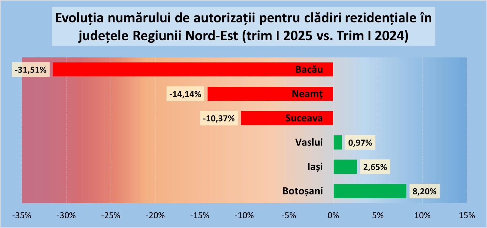La nivel național numărul autorizațiilor de construire pentru clădiri rezidențiale a crescut în primul trimestru din 2025 (cu 2,8% față de aceeași perioadă a anului trecut. Totuși, în Regiunea Nord-Est s-a înregistrat o scădere de 8,4%, cu evoluții contradictorii de la un județ la altul. Iașul se menține pe o traiectorie ușor ascendentă, în timp ce județe precum Suceava și Bacău înregistrează scăderi abrupte, semn că dinamica dezvoltării imobiliare în zonă este încă dezechilibrată.