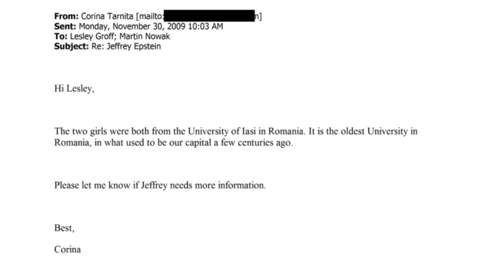 Într-un alt e-mail, Corina Târniță îi transmite asistentei lui Epstein, Lesley Groff, că „ambele fete erau de la Universitatea din Iași, România”, menționând că este cea mai veche universitate din țară. Mesajul sugerează existența unor legături directe între persoane din Iași și anturajul lui Epstein.