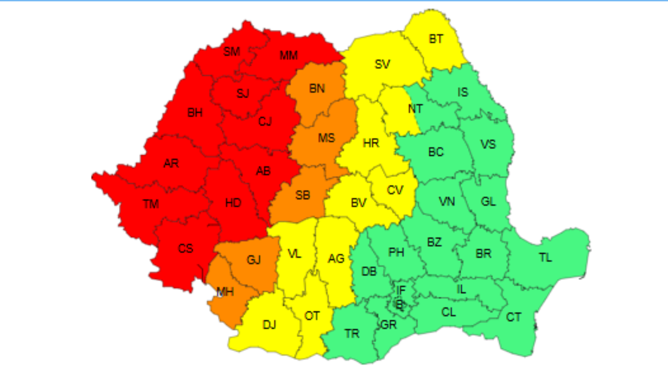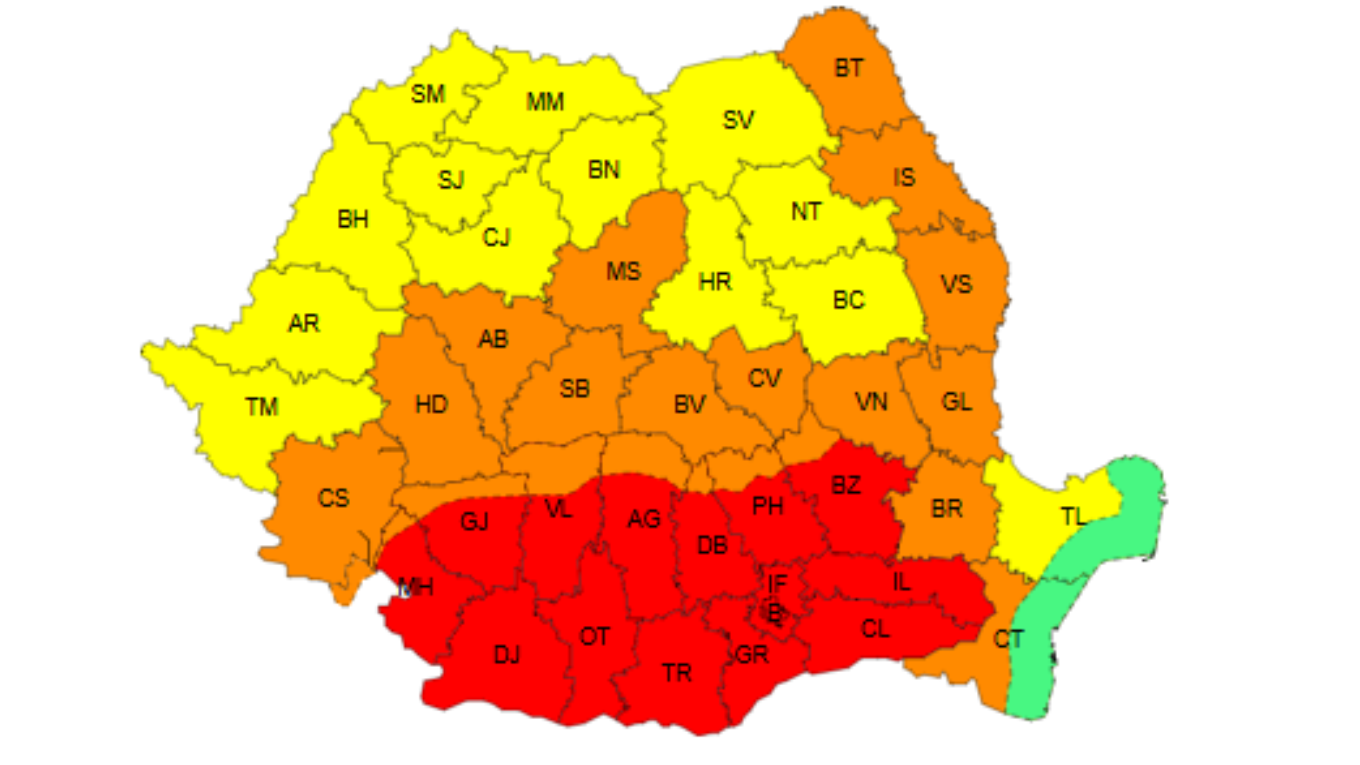 Printre județele aflate sub Cod Roșu se numără: Mehedinți, Gorj, Dolj, Olt, Vâlcea, Argeș, Teleorman, Giurgiu, Dâmbovița, Prahova, Buzău, Ialomița, Călărași, Ilfov și municipiul București.