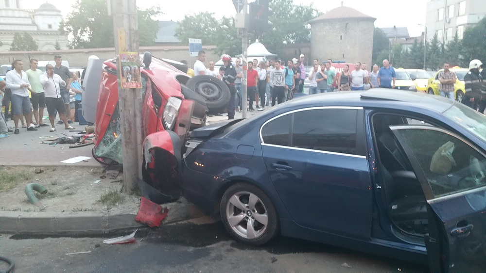 Şoferul BMW-ului care depăşea cu „bliţuri“, după cum susţine un martor, a intrat în plin într-un Logan care vira pe strada de lângă parcarea de la Mănăstirea Golia. Logan-ul a fost întors pe o parte şi aruncat într-un stâlp.