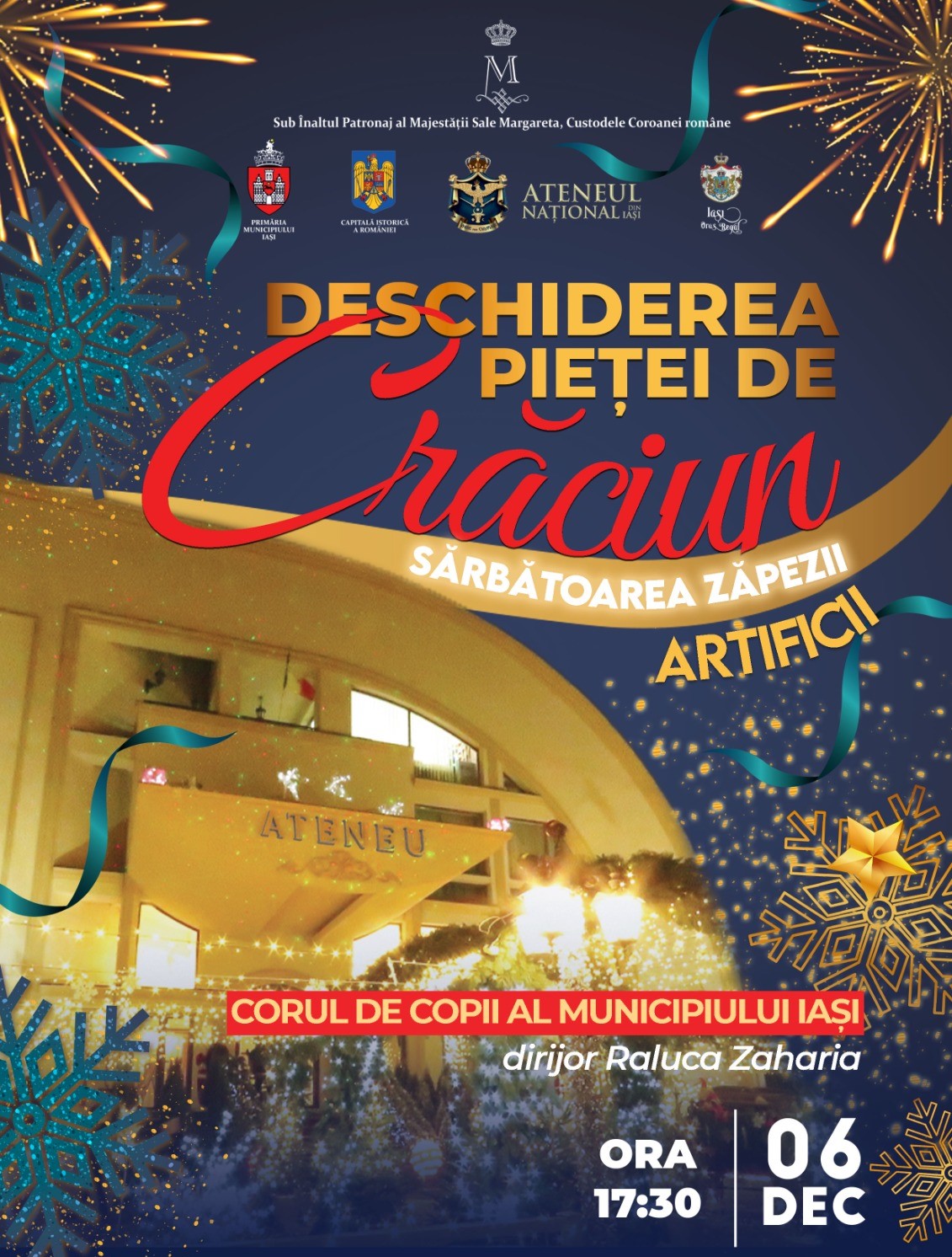 Activităţile vor începe la ora 17:30 în parcul din faţa Ateneului Naţional, odată cu deschiderea Pieţei de Crăciun, unde Corul de Copii al Municipiului Iaşi va susţine un recital sub îndrumarea Ralucăi Zaharia. Evenimentul va continua cu întâlnirea cu Moş Crăciun şi un spectacol de focuri de artificii, iar cei mici se vor putea bucura de zăpadă artificială.