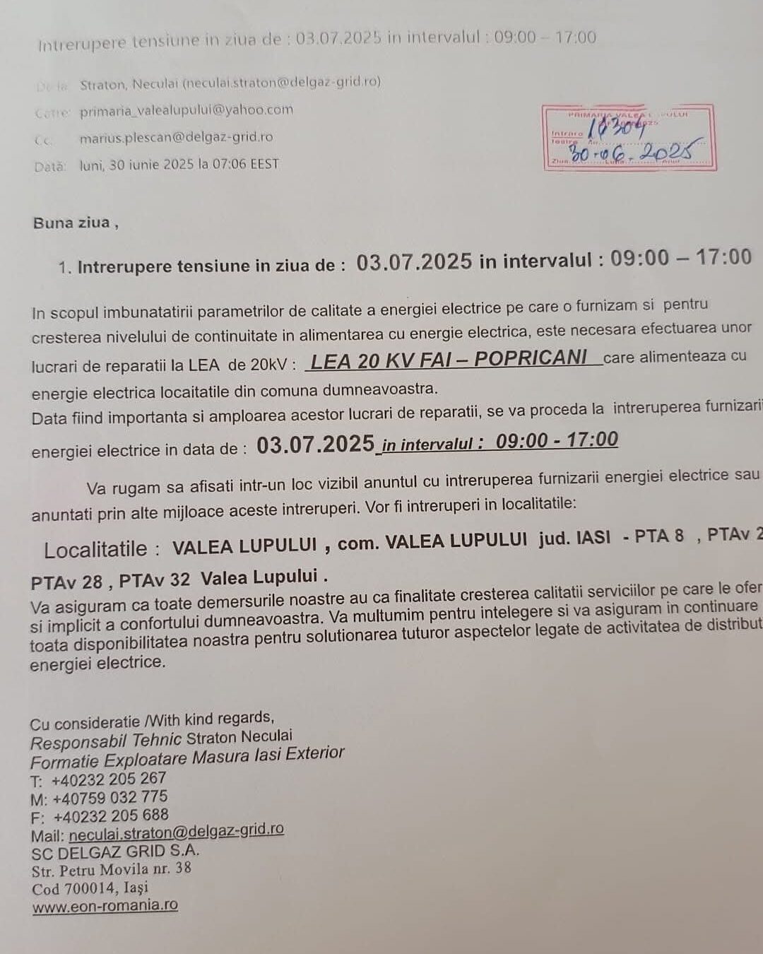 Este vorba de comuna-cartier Valea Lupului, unde alimentarea cu energie electrică va fi întreruptă între orele 9-17.