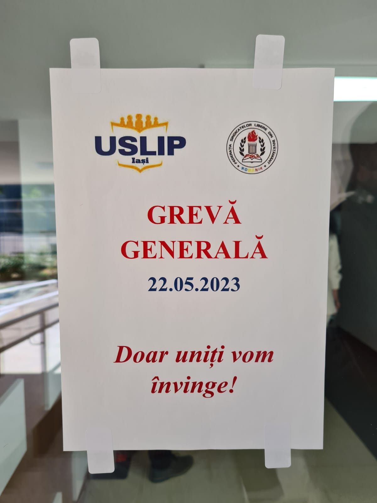 Unitățile de învățământ preuniversitar din România au intrat în grevă generală astăzi, 22 mai 2023. Aproape toate unitățile din Iași s-au alăturat grevei, adică în jur de 8.000 de angajați în învățământ. Copiii stau acasă astăzi și sunt șanse mari să nu meargă la școală nici în zilele următoare.