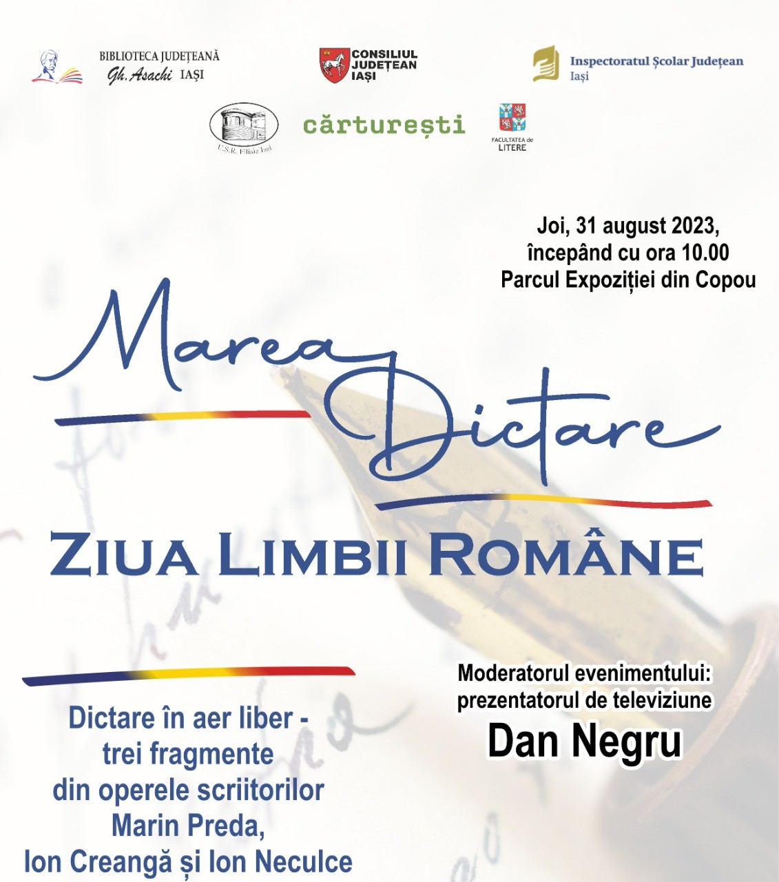 Când aţi scris ultima dată după dictare? Cu ocazia Zilei Limbii Române, aveţi oportunitatea de a vă testa abilităţile de scriere după dictare şi de a vă pune la încercare cunoştinţele gramaticale şi ortografice. Evenimentul „Marea Dictare” va avea loc în Parcul Expoziţiei din Copou, joi, 31 august, de la ora 10:00, şi va fi moderat de cunoscutul prezentator de televiziune Dan Negru.