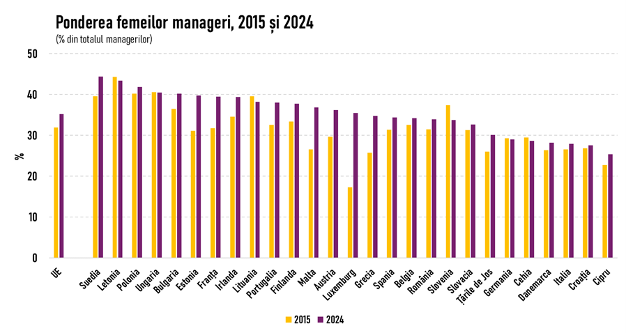 Ponderea femeilor manageri la nivelul Uniunii Europene la nivelul anilor 2015 și 2024. (sursa datelor: Eurostat 2025)