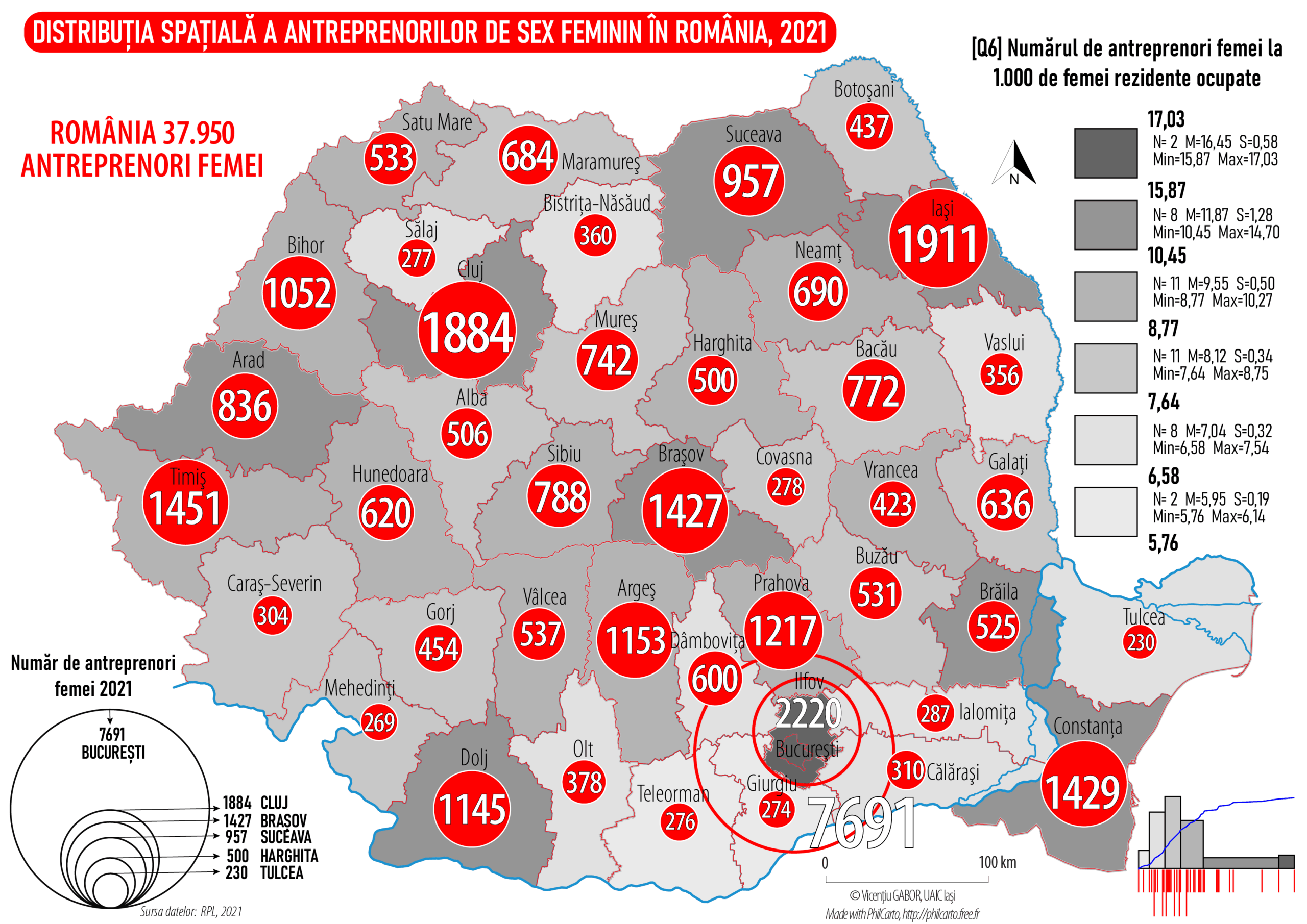 Distribuția spațială a antreprenorilor de sex feminin în România, 2021 (sursa datelor: Recensământul Populației și Locuințelor 2021)