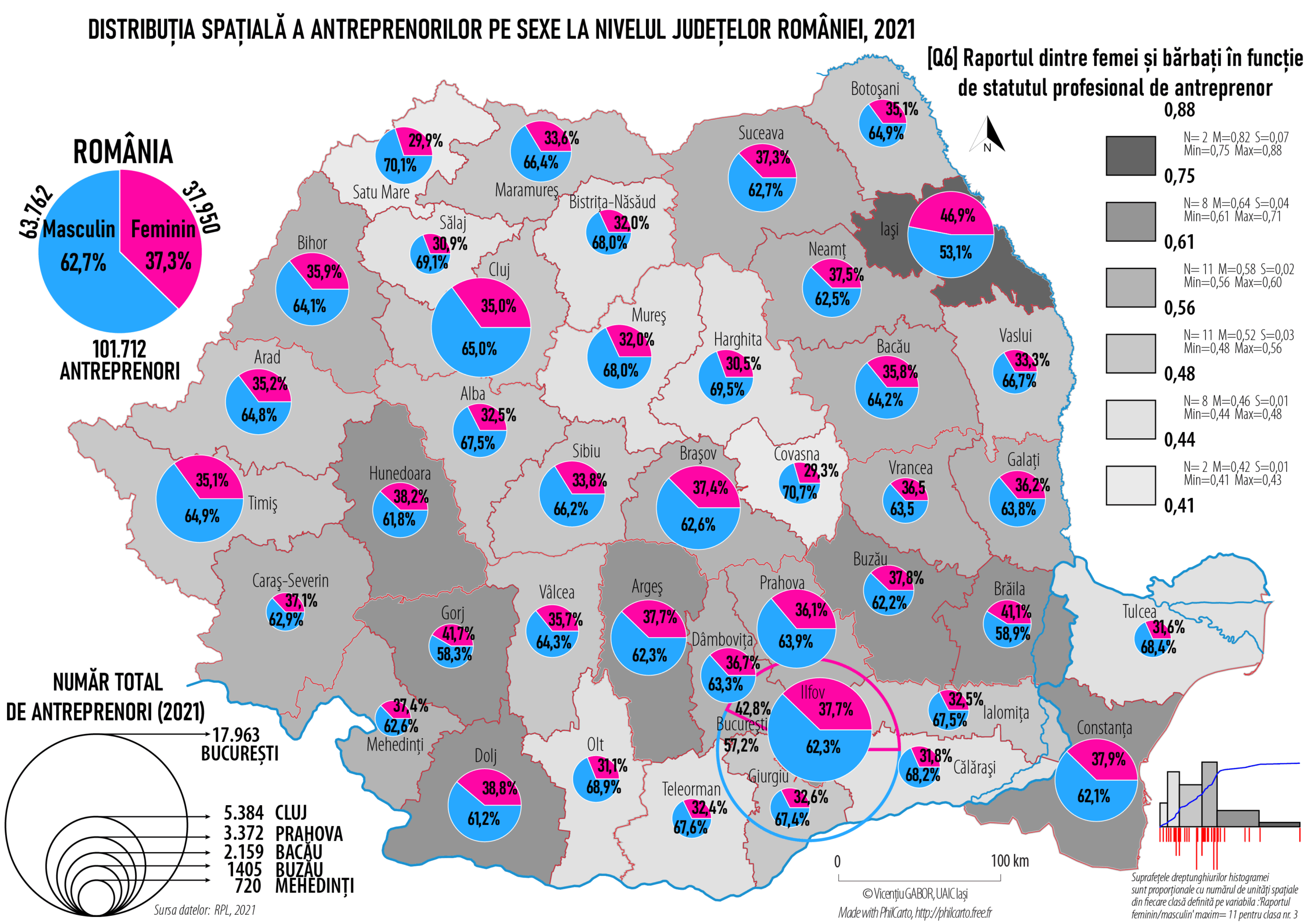Distribuția spațială a antreprenorilor pe sexe la nivelul județelor României, 2021 (sursa datelor: Recensământul Populației și Locuințelor 2021)