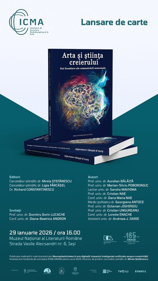 Institutul de Cercetare Multidisciplinară în Artă (ICMA) al Universității Naționale de Arte „George Enescu” din Iași (UNAGE) anunță lansarea volumului „Arta și știința creierului. Noi frontiere ale comunicării neuronale”, eveniment care va avea loc pe 29 ianuarie 2026, de la ora 16.00, la Sala de Conferințe a Casei Muzeelor (str. Vasile Alecsandri nr. 6).