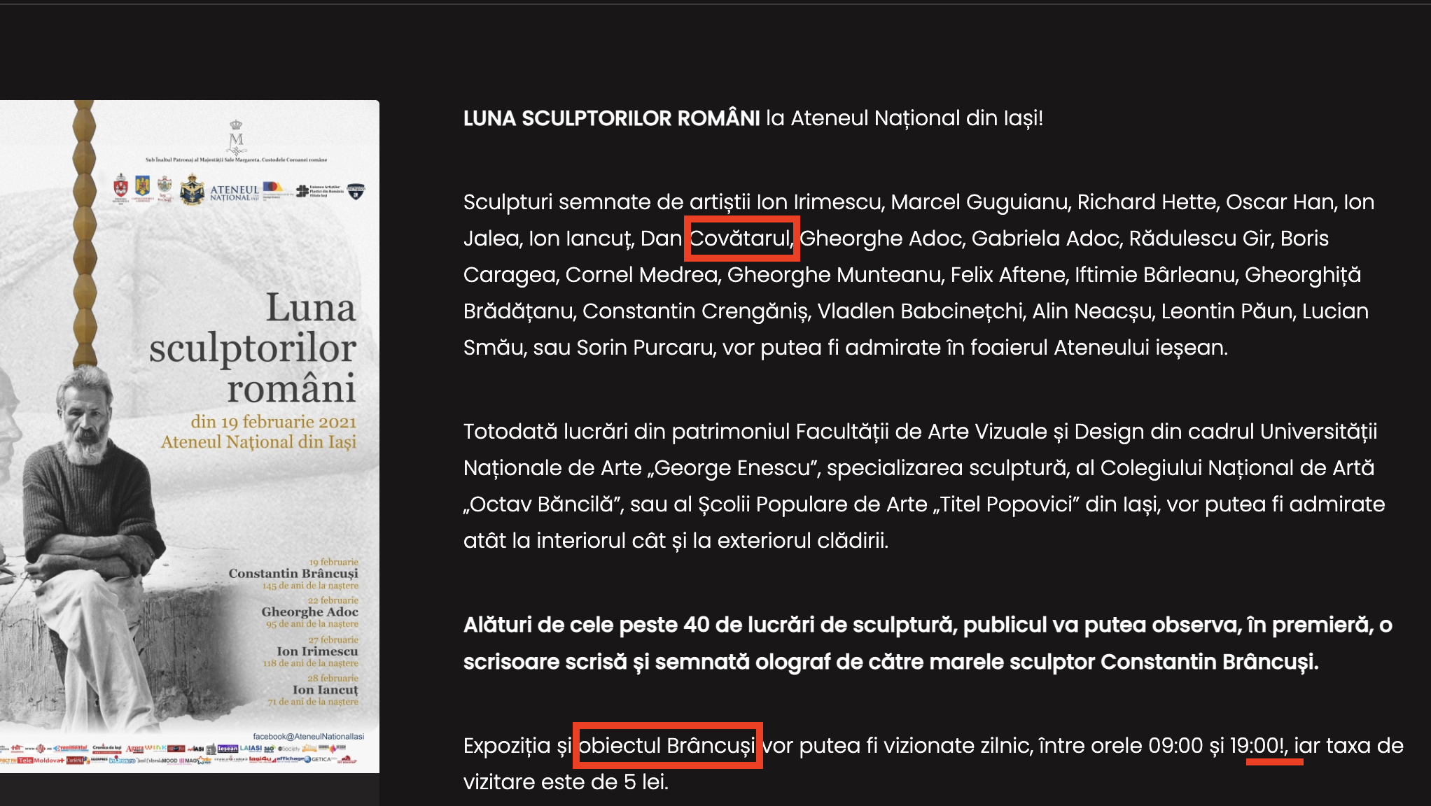P.S. În fond, e utopic să te aştepţi de la o instituţie, care pe pagina proprie dedicată evenimentului stâlceşte numele unuia dintre artişti şi se referă la o scrisoare semnată de cel mai mare sculptor român ca la „obiectul Brâncuşi”, să înţeleagă semnificaţia demersului de a promova arta contemporană în spaţiul public şi necesitatea unei medieri profesioniste.