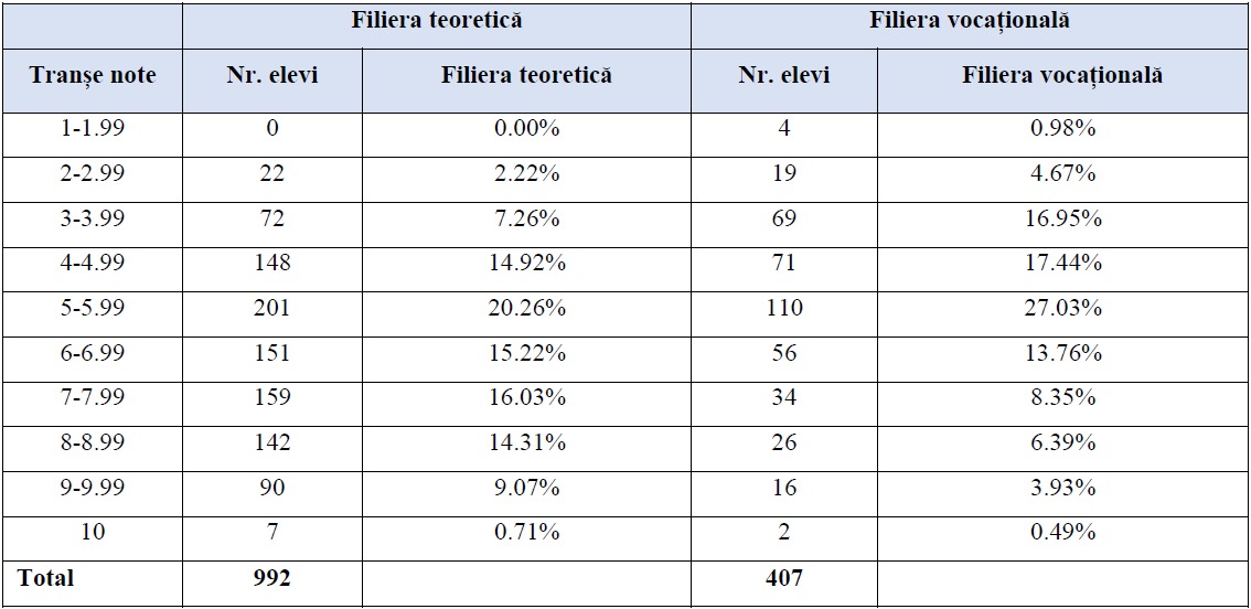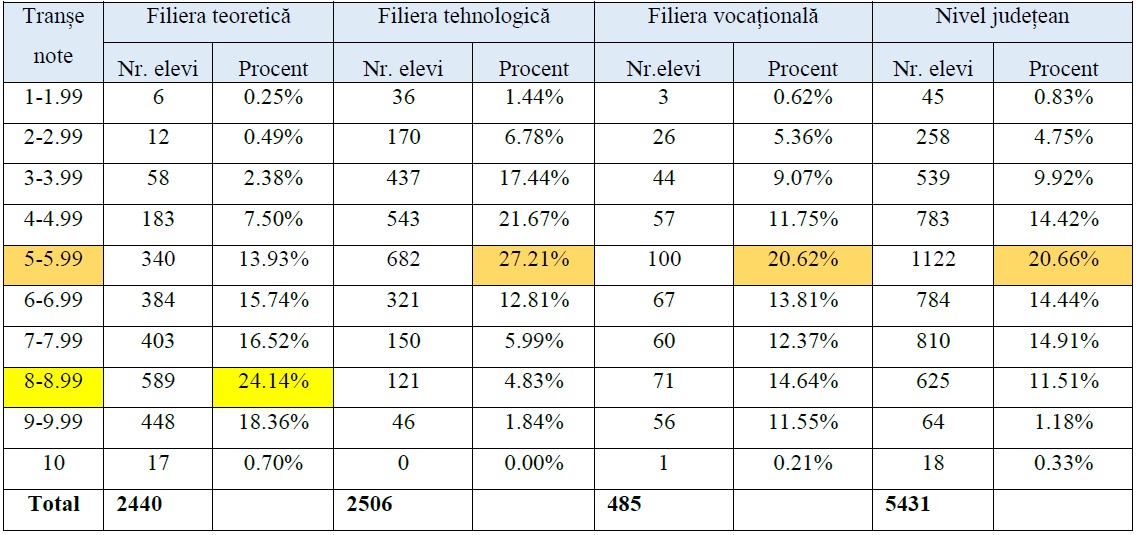 La filiera teoretică, cele mai multe note au fost în intervalul 5,00-5,99 (20,26%), urmate de 7,00-7,99 (16,03%) și 6,00-6,99 (15,22%). La filiera vocațională, 27,03% dintre elevi au obținut note între 5,00 și 5,99, urmați de cei cu note între 4,00-4,99 (17,44%) și 3,00-3,99 (16,95%).