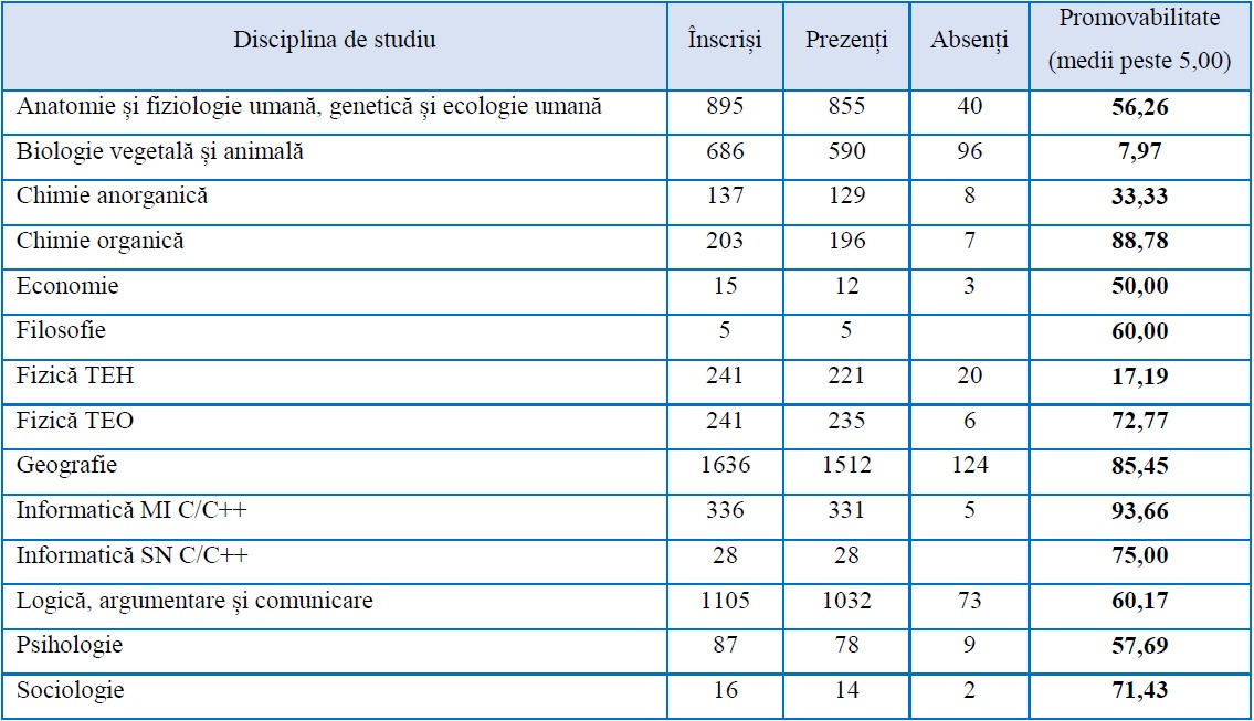 În total, au fost acordate 41 de note de 10, distribuite astfel: Anatomie – 8, Chimie organică – 1, Fizică – 5, Geografie – 15, Informatică MI – 7 și Logică – 5.