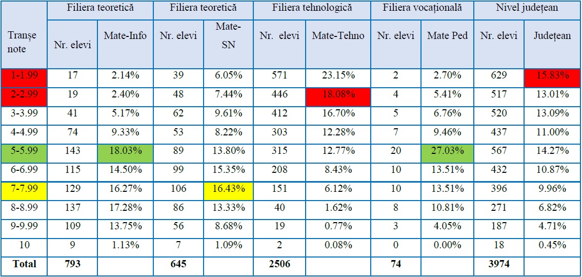 În cadrul filierei teoretice, intervalul cel mai reprezentativ este 8,00-8,99, cu 24,14% dintre note, urmat de intervalul 9,00-9,99 (18,36%) și de 7,00-7,99 (16,52%). La filiera tehnologică, distribuția notelor se concentrează în zona inferioară: 27,21% în intervalul 5,00-5,99, 21,67% între 4,00-4,99 și 17,44% între 3,00-3,99.