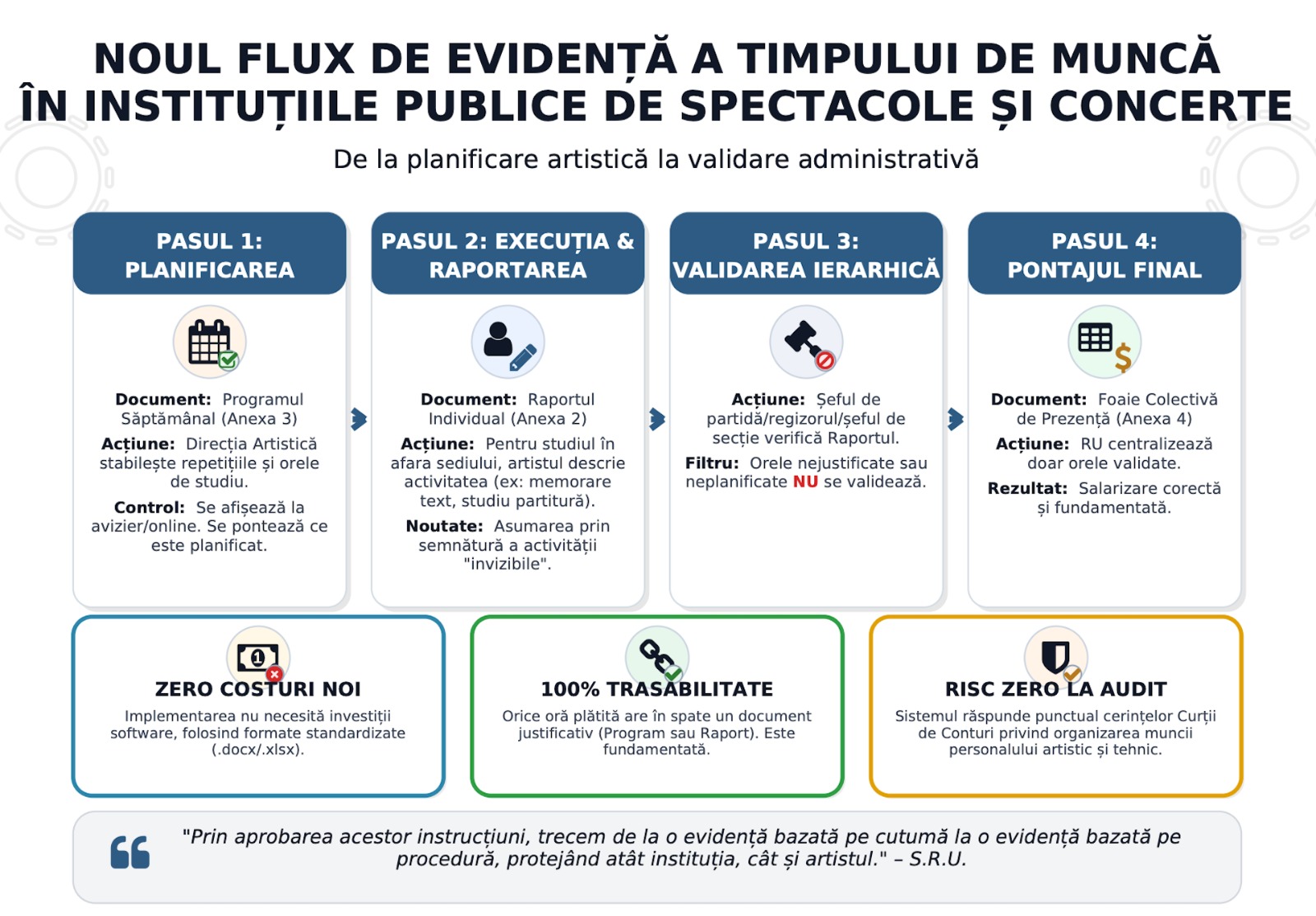 Ministerul Culturii prezintă aceste instrucțiuni drept un „nou flux de la planificarea artistică la validarea administrativă”, care presupune completarea unui program săptămânal de lucru, a unui raport individual de activitate și a unei foi colective de prezență. Potrivit Ministerului, „aplicarea unitară urmărește creșterea predictibilității și trasabilității, reducerea interpretărilor neunitare”.