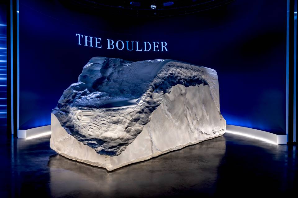 Sub denumirea „THE BOULDER”, sculptura cu aspect de piatră solidă, lungă de 6,5 metri și înaltă de 2,75 metri, dezvăluie primele contururi ale noii generații Sprinter. Frezată dintr-o singură bucată de material, lucrarea combină arta cu meșteșugul pentru a transmite valorile fundamentale ale mărcii: robustețe, fiabilitate, versatilitate și durabilitate.