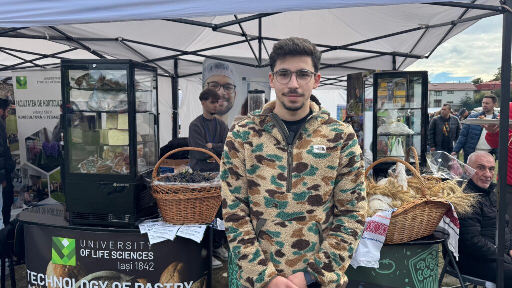 Tudor, student în anul IV la Tehnologii alimentare din cadrul USV Iași, a vorbit vizitatorilor despre creațiile realizate de studenții de la Facultatea de Agricultură. În centrul atenției s-a aflat fructul aronia, apreciat pentru proprietățile sale antioxidante și valoarea nutrițională.