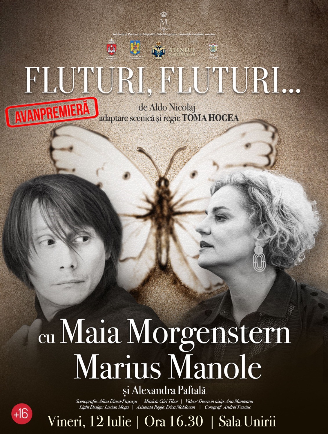 Premiera spectacolului de teatru „Fluturi, fluturi…”, cu Maia Morgenstern și Marius Manole în rolurile principale, va avea avanpremiera și premiera pe 12 iulie, de la ora 16:30, respectiv de la ora 19, la Sala Unirii a Ateneului Național din Iași. Textul aparține dramaturgului italian Aldo Nicolaj, iar regia este semnată de Toma Hogea.