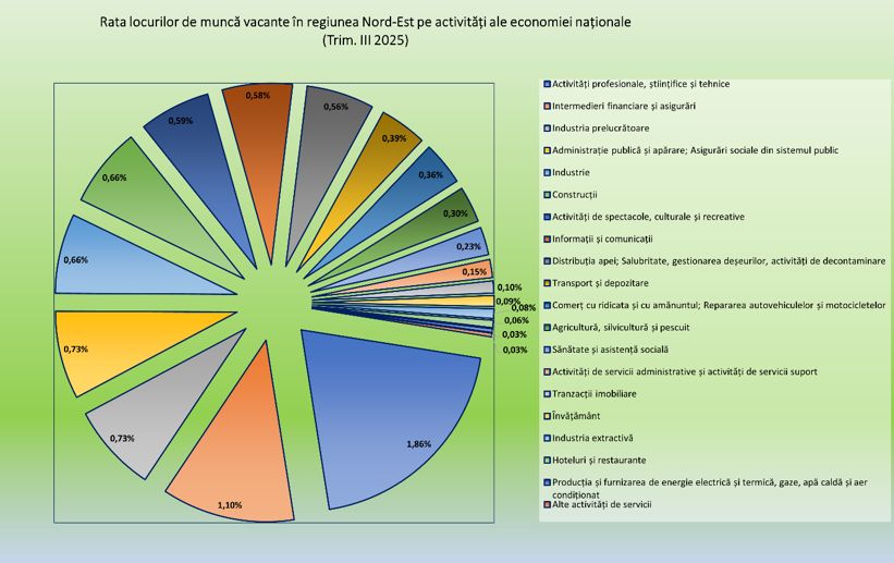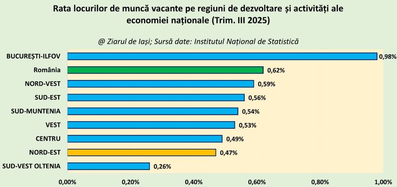 Există însă și domenii în care piața muncii din Nord-Est funcționează mult mai bine. În hoteluri și restaurante, potrivit statisticii, rata locurilor vacante este de doar 0,06%, iar în învățământ de 0,09%. Asta arată fie o disponibilitate mare de personal, fie un ritm mai lent de extindere a activităților. Sănătatea și asistența socială stau, de asemenea, surprinzător de bine, cu 0,23%, o valoare ce contrastează puternic cu București-Ilfov, unde nevoia de personal medical a împins rata la 1,36%.