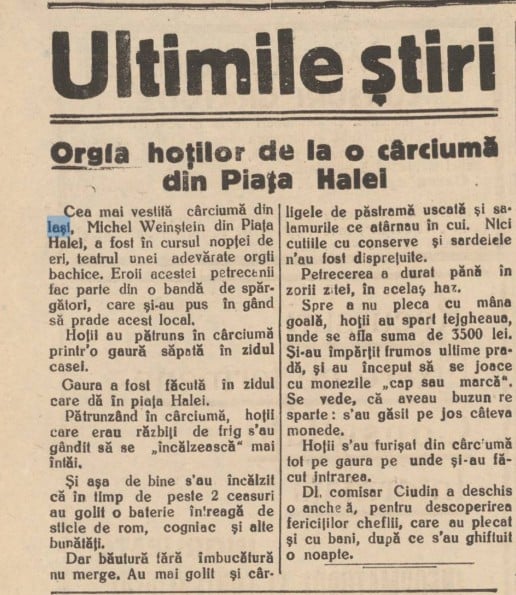 Cea mai cunoscută cârciumă din Iașul anului 1925, cea a comerciantului de băuturi alcoolice Michel Weinstein, a fost scena unui jaf inedit în noaptea de 20 spre 21 noiembrie. O bandă de hoți a pătruns în cârciumă printr-o gaură făcută în zidul dinspre piața Halei. Ce a urmat, aflăm din presa vremii.