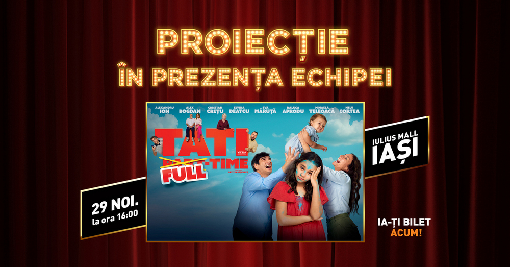Sâmbătă, de la ora 16.30, povestea continuă cu premiera filmului „Tati Full Time”, la care îi poți întâlni pe Eva Măruță, Alex Bogdan și Raluca Aprodu. Regizoarea Letiția Roșculeț și Cătălin Măruță vor fi, de asemenea, prezenți la Cinema City Iași pentru a discuta cu publicul ieșean.