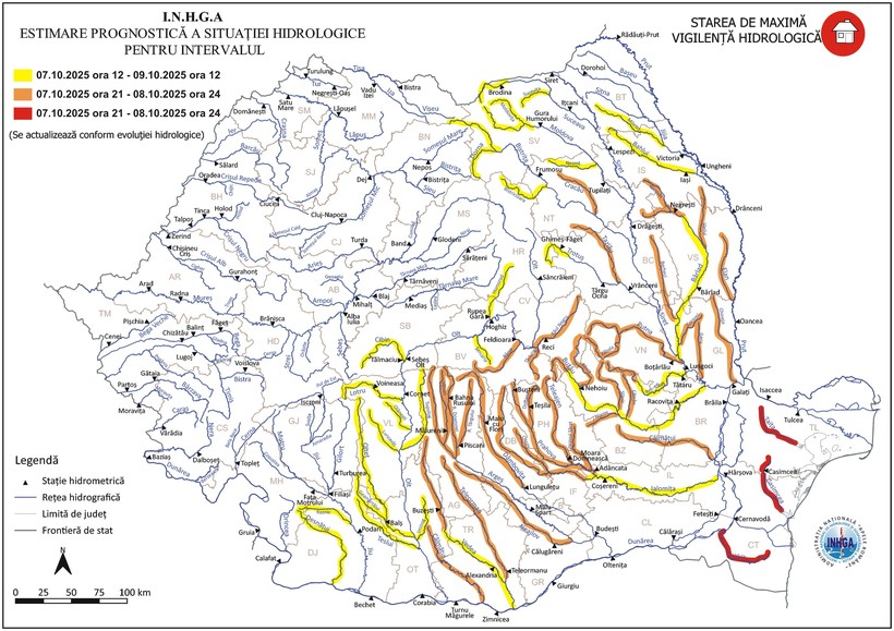 Hidrologii au actualizat avertizarea emisă, râurile din judeţele Constanţa şi Tulcea urmând să fie sub Cod roşu de marţi seară până miercuri noapte. Totodată, a fost emis Cod portocaliu pentru sectoare de râuri din alte 19 judeţe. Sunt aşteptate scurgeri importante pe versanţi, torenţi şi pâraie, viituri rapide pe râurile mici cu posibile efecte de inundaţii locale şi creşteri de debite şi niveluri. De asemenea, există probabilitatea depăşirii cotelor de apărare,