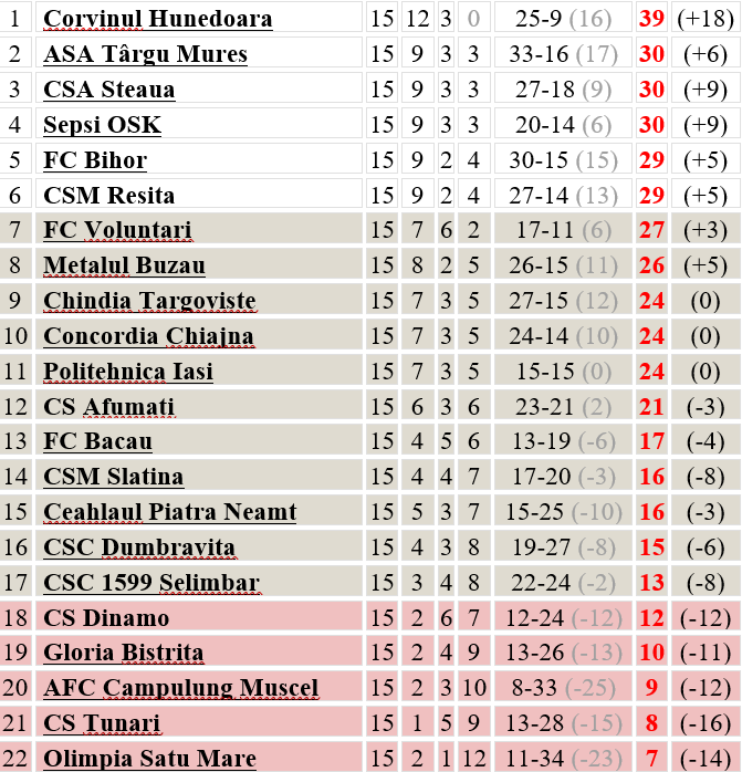 După 15 runde, clasamentul Ligii a II-a arată astfel: