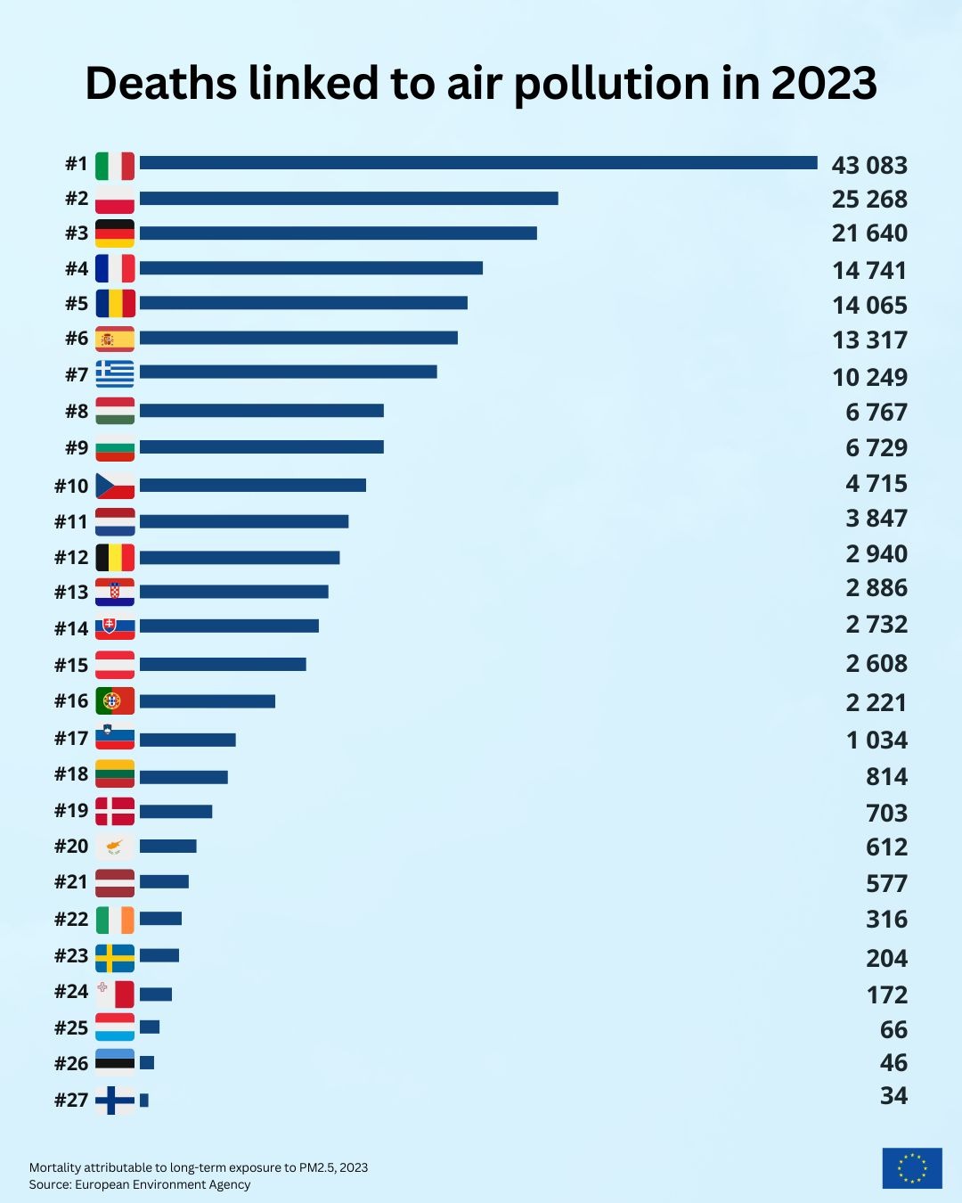 Comparativ cu alte state europene, România se situează între Germania și Franța, țîri însă cu o populație aproape triplă, în ceea ce privește numărul de decese atribuite poluării aerului. Italia conduce în clasament, cu peste 43.000 de decese, urmată de Polonia și Germania – situație care subliniază importanța măsurilor urgente pentru protecția sănătății publice și a mediului.
