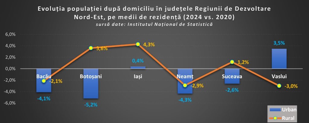 Dintre județele Regiunii de Dezvoltare Nord-Est, doar în Iași populația după domiciliu a crescut, atât în mediul urban, cât și în rural, în acest interval de timp. De altfel, Iaşul a înregistrat și cea mai mare creștere procentuală a populației din mediul rural (+4,3%) în perioada analizată, cel mai probabil ca urmare a migrației în special a familiilor tinere către comunele limitrofe: Valea Lupului, Miroslava, Aroneanu, Tomești, în timp ce în orașe populația a crescut în 2024 față de 2020 cu doar 0,4%.