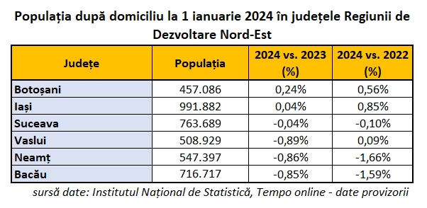 Procentual, în ultimii doi ani, populația județului Iași a crescut cu 0,85%, cea din Botoșani cu 0,56% iar din Vaslui cu 0,09%, în timp ce populația după domiciliu din Suceava a scăzut cu 0,10%, cea din Bacău cu 1,59%, iar din Neamț cu 1,66%.