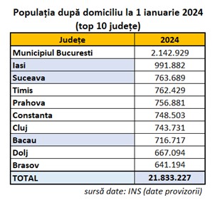 România avea conform primelor date ale INS o populație de 21.833.227 de persoane după domiciliu la 1 ianuarie 2024, în scădere cu 176.569 persoane (0,8%) față de anul anterior. Și asta pentru că în 36 de județe (inclusiv București) populaţia a scăzut.