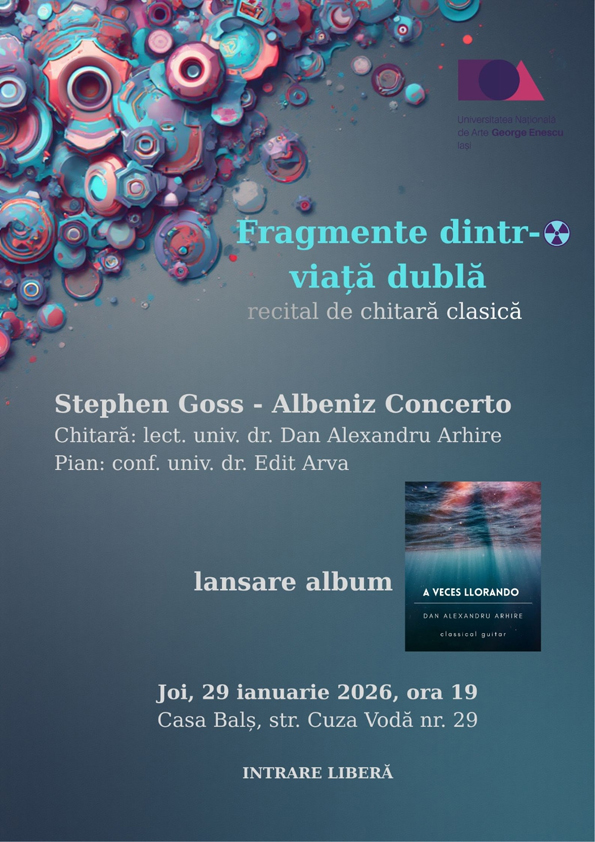 Publicul ieșean este invitat astăzi, de la ora 19.00, în Sala Eduard Caudella a Casei Balș (Str. Cuza Vodă nr. 29), la un eveniment muzical deosebit: recitalul de chitară clasică „Fragmente dintr-o viață dublă”.