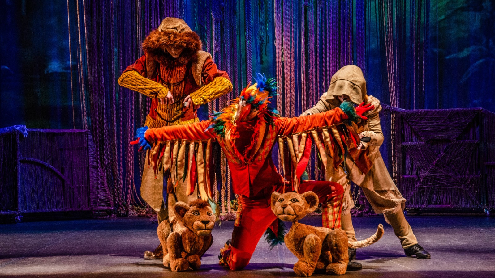 Distribuția completă, care evoluaeză coral, demonstrând abilități interpretative complexe, este următoarea: Aurelian Diaconu/Claudiu Gălățeanu (regele ADOFO); Ileana Ocneanu (regina ADAMA); Viorel Vârlan/Ioana Corban (înțeleptul AFI); Alex Iurașcu (prințul junglei, AMIRI); Beatrice Volbea (mica leoaică AISHA); Iulia Deloiu Trif (mama AISHEI); Dragoș Maftei (fratele regelui, HOR); Alexia Botezatu/Cezar Ichim (vestitorul AKOKO); Cristian Gheorghiu (Hei); Ionela Arvinte (Hai); Cosmin Rotariu (Hui); Liliana Mavriș Vârlan/Carmen Mihalache (încântătoarea AYO); George Cocoș (marele chef HANI); Raluca Pintilie, Ioana Iordache, Liliana Mavriș Vârlan, Cristian Gheorghiu, Cosmin Rotaru, Alexia Botezatu, Maria Gorodea, Camelia Dilbea (alte hiene); Elena Zmuncilă, George Cocoș, Iulia Deloiu Trif, Beatrice Volbea, Viorel Vârlan, Ioana Corban, Carmen Mihalache (lei, leoaice), Cătălin Cucu, Ioana Iordache (girafe), Carmen Mihalache, Ioana Iordache, Iulia Deloiu Trif, Elena Zmuncilă, Ileana Ocneanu, Viorel Vârlan, Ioana Corban, Alexia Botezatu, George Cocoș, Sebastian Pricop (cete gnu); Ionela Arvinte, Carmen Mihalache, Beatrice Volbea, Iulia Deloiu Trif și Elena Zmuncilă (vulturi).