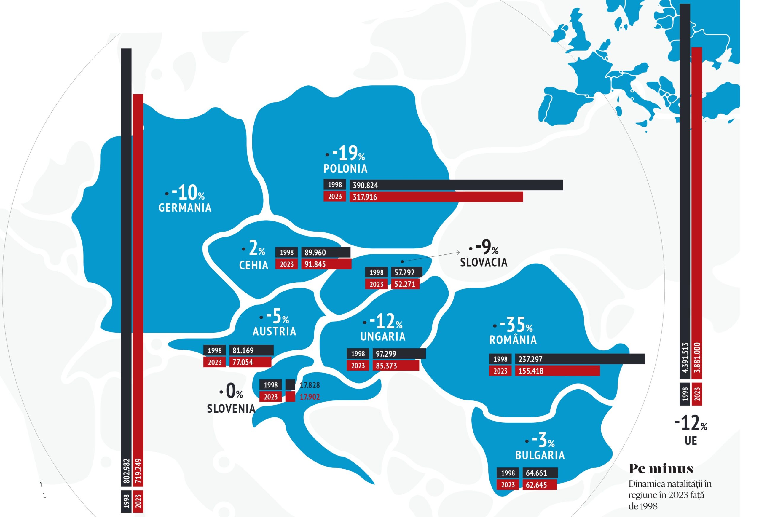 Iată un grafic relevant, care arată cu cât a scăzut natalitatea în ultimii ani (1998-2023) în Europa, pe țări! România are o cădere absolut dramatică.