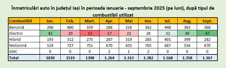 În total, la Iași au fost înmatriculate 1.367 de autoturisme, o valoare stabilă față de august (1.358), dar cu o compoziție diferită pe tipuri de combustibil și vechime.