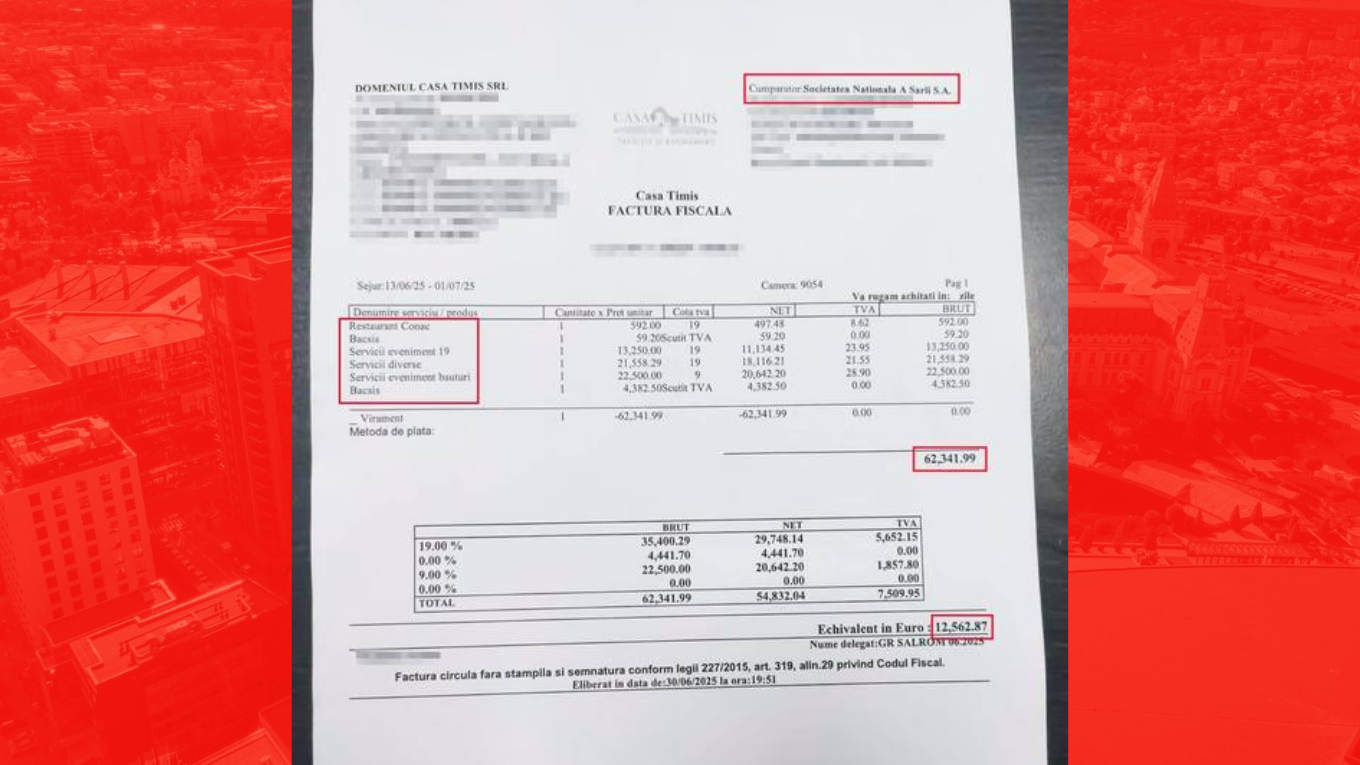 „Factura prezentată în mass-media nu a fost achitată de către SNS SA – Salrom, deoarece conţine o eroare de redactare, nu a fost vorba de un sejur la locaţia respectivă, ci de un eveniment singular care a avut loc în după amiaza zilei de 13 iunie 2025, la încheierea conferinţei anuale EUSalt 2025. Suma de 62.000 de lei (…) ar reprezenta costul plătit de către SNS SA – SALROM pentru organizarea evenimentului de închidere a conferinţei EUSalt 2025”, precizează societatea.