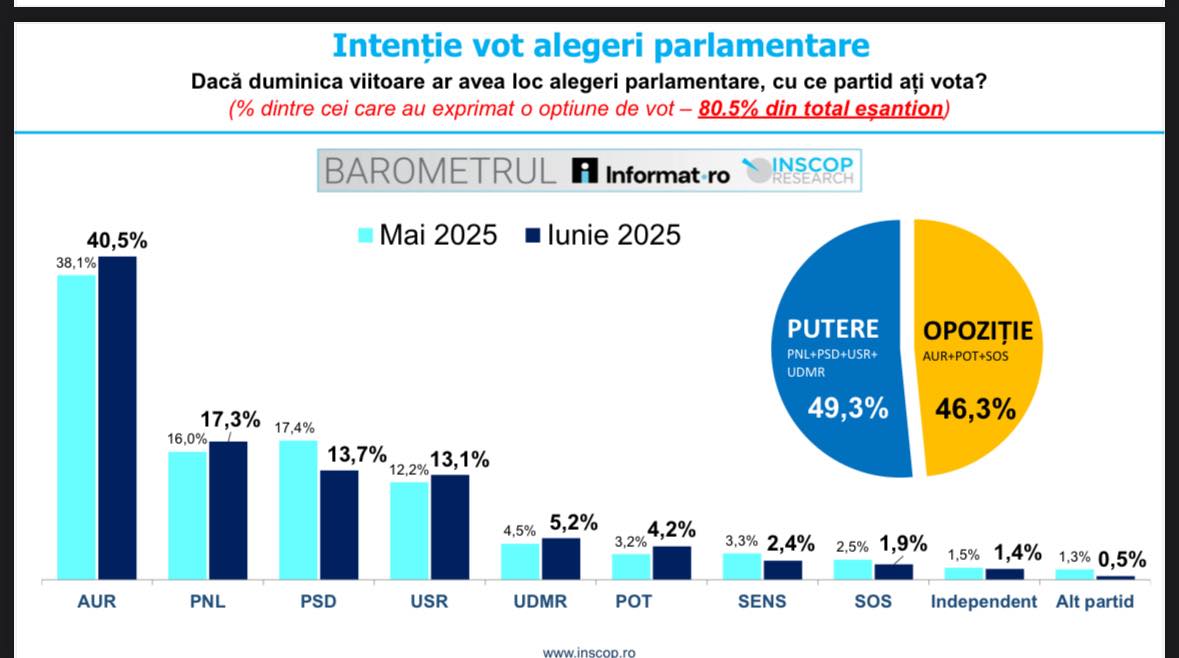 PNL urcă pe locul al doilea, cu 17.3%, în creștere față de luna mai (16%). PSD coboară la 13.7%, iar USR se apropie periculos, cu 13.1%. UDMR înregistrează un ușor avans (5.2%), în timp ce formațiunile mai mici cumulează scoruri modeste: POT – 4.2%, SENS – 2.4%, SOS România – 1.9%. Preferința pentru candidați independenți rămâne la 1.4%, iar alte partide abia adună 0.5%.
