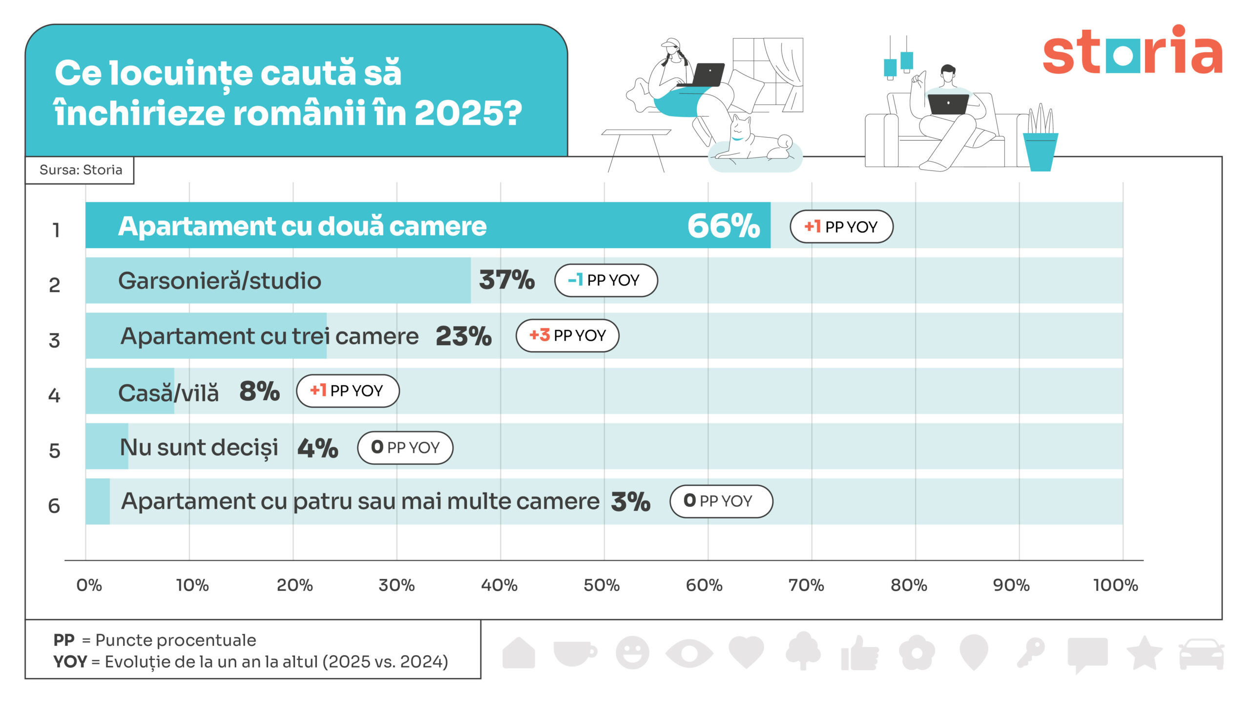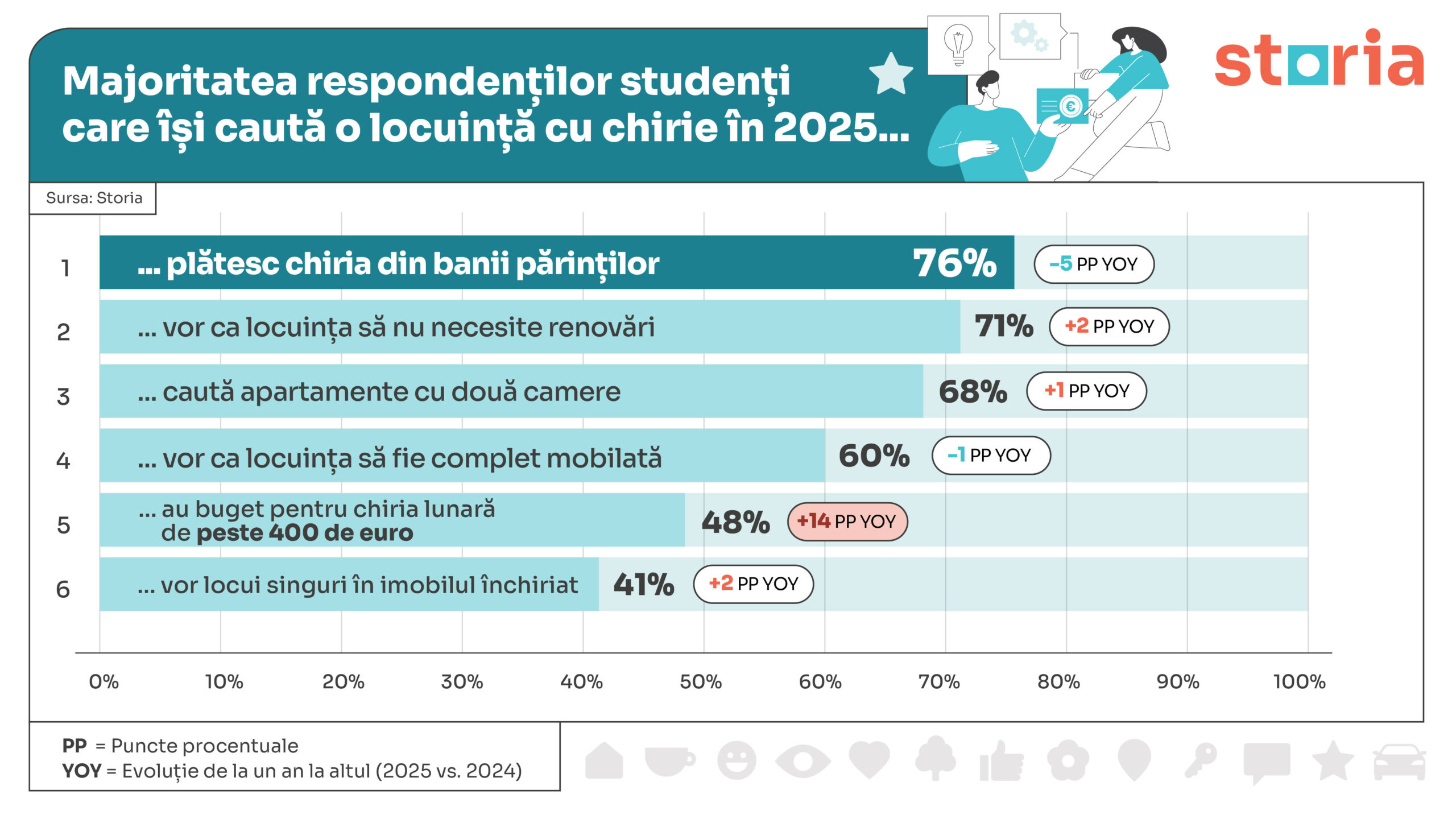 Mai mult de jumătate dintre respondenții sondajului (52%) declară că bugetul lor pentru chirie depășește pragul de 400 de euro, iar în rândul studenților aproape jumătate (48%) se află în aceeași categorie, majoritatea fiind sprijiniți financiar de părinți (76%). Tendințele reies din cel mai recent sondaj anual realizat de Storia, platforma de imobiliare lansată de OLX. Sondajul a fost realizat în rândul celor aflați în căutarea unei locuințe de închiriat în perioada august – octombrie 2025: 40% studenți și 60% nonstudenți. Spre deosebire de anul trecut, când proporția era egală (50%-50%), anul acesta se observă că mai mulți nonstudenți sunt interesați de închirieri.