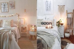 Pentru a fi în tendința de decor boem chic, adăugați lumânări care să creeze o atmosferă intimă seara. Pot fi aranjate pe mobilierul dormitorului pentru a oferi o atmosferă intimă.