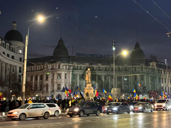 Oamenii s-au adunat în Piața Universității și strigă: „Unitate națională”, „Eminescu” și „Călin Georgescu este președinte”.