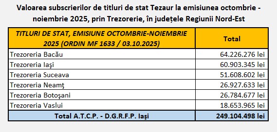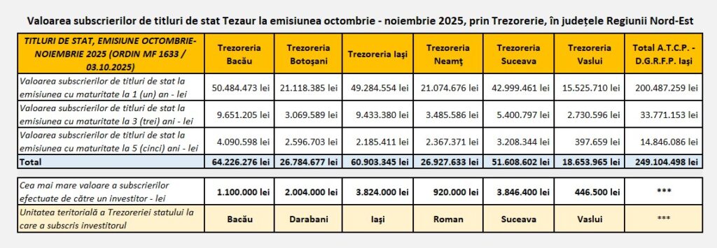 Doar prin unitățile de trezorerie, populația din regiunea Nord-Est a investit în perioada octombrie – noiembrie, în a zecea ediție de emisiuni Tezaur, o sumă echivalentă cu circa 50 de milioane de euro (249.104.498 lei). Mai mult de jumătate din această sumă a venit din județele Bacău și Iași, cu peste 60 milioane lei fiecare. Suceava urmează, cu 41,6 milioane lei, în timp ce Neamț, Botoșani și Vaslui se situează sub pragul de 30 milioane lei. Distribuția sugerează o corelație între nivelul de urbanizare, puterea economică locală și apetitul pentru investiții sigure, cu Iași și Bacău consolidându-și rolul de poli regionali ai economisirii.