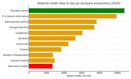 Privind în detaliu salariile pe ramuri economice, discrepanțele sunt evidente. Cei mai bine plătiți angajați din Iași au fost în 2024 cei din transporturile aeriene, cu un câștig mediu net lunar de 10.789 de lei, urmați de specialiștii din IT și comunicații, unde salariile au depășit pragul de 9.000 de lei (9.392 lei, respectiv 9.900 lei în activitățile de servicii informatice). În același pluton al veniturilor ridicate se află și angajații din administrația publică (7.650 lei) sau din producția și furnizarea de energie (7.400 lei). La polul opus, salariile cele mai mici s-au înregistrat în industria mobilei (2.666 lei), confecții (2.923 lei) și hoteluri și restaurante (2.724 lei), domenii în care câștigurile rămân cu mult sub media județeană. Între aceste extreme se așază sectoare precum sănătatea (5.274 lei), învățământul (6.050 lei), construcțiile (4.476 lei) sau comerțul (3.662 lei), desenând un tablou contrastant al economiei ieșene.