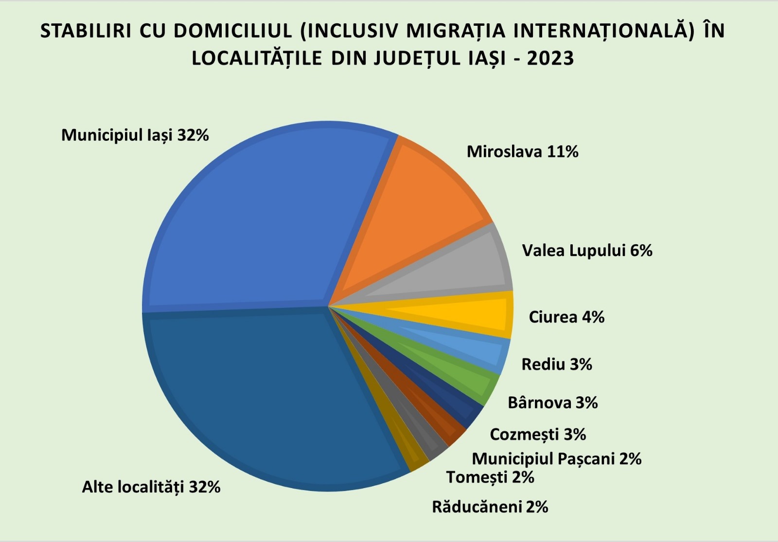 Iar localitățile cele mai atractive pentru stabilirea domiciliului s-au dovedit anul trecut (excluzând migrația internațională) comunele Miroslava (849 plecări cu domiciliul, față de 3.251 sosiri), Valea Lupului (368 plecări, față de 1.739 sosiri), Ciurea (488 plecări, 1.148 sosiri), Bârnova (216 plecări, 870 sosiri) și Rediu (322 plecări, față de 932 sosiri).