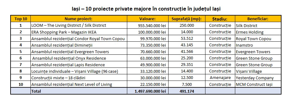 Județul Iași se află în plin proces de transformare, cu investiții private majore care dau amploare unei noi ere de dezvoltare urbană. Peste 1,4 miliarde de lei sunt alocate în acest moment pentru zece proiecte importante aflate în diferite stadii de construcție, ce însumează aproape jumătate de milion de metri pătrați de spații rezidențiale, comerciale și mixte.