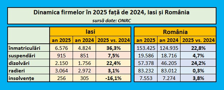 „Asta e viața economică a firmelor, unele își suspendă activitatea, altele se dizolvă. Dacă ne uităm și la cele nou înființate vom vedea că au apărut mult mai multe firme noi”, a declarat Paul Butnariu. Iar cifrele ONRC îi dau dreptate: în 2025, au fost înmatriculate 6.576 de firme, cu aproximativ 1.750 mai multe decât în 2024 – ceea ce înseamnă că numărul firmelor nou înființate în județul Iași a crescut cu peste 36% față de 2024, în timp ce la nivel național creșterea a fost de aproape 23%.