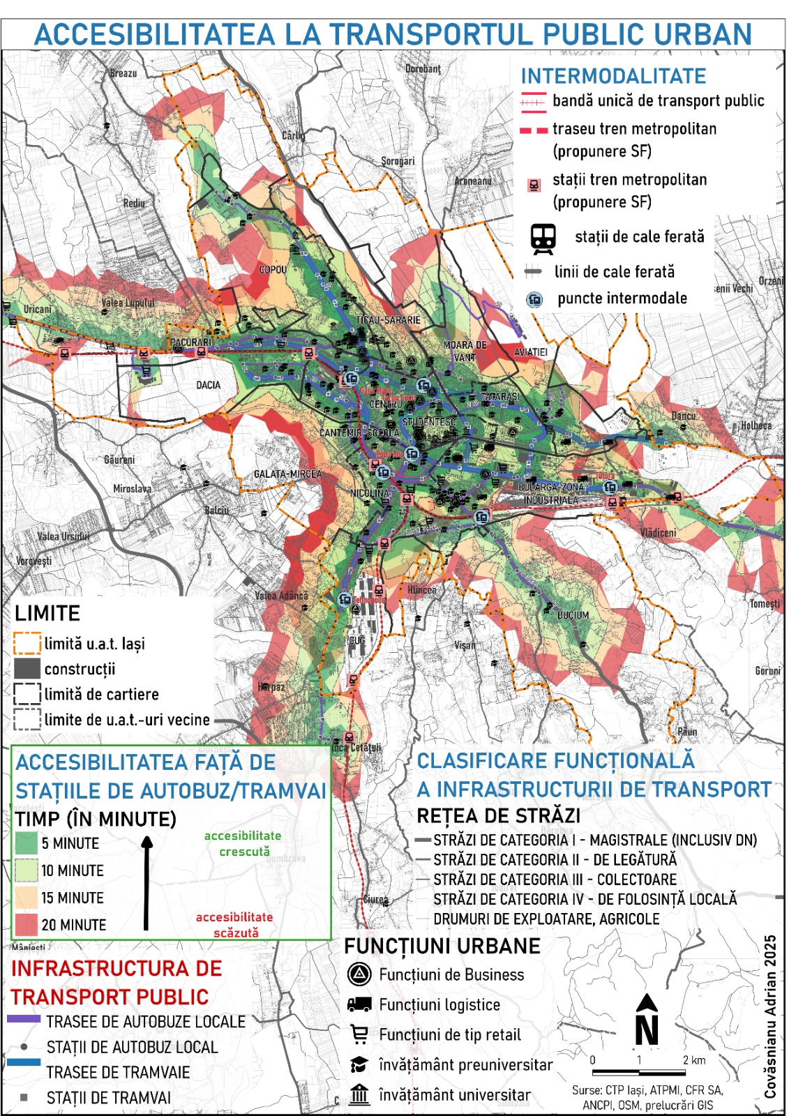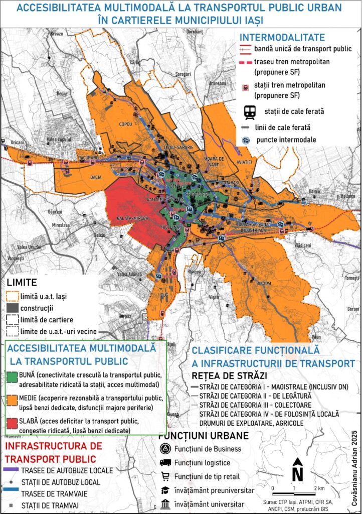 - Cartierele centrale caracterizate de mixitate funcțională (Centru, Cantemir-Socola) oferă un nivel superior de accesibilitate, datorită rețelei de transport cu conexiuni diverse.