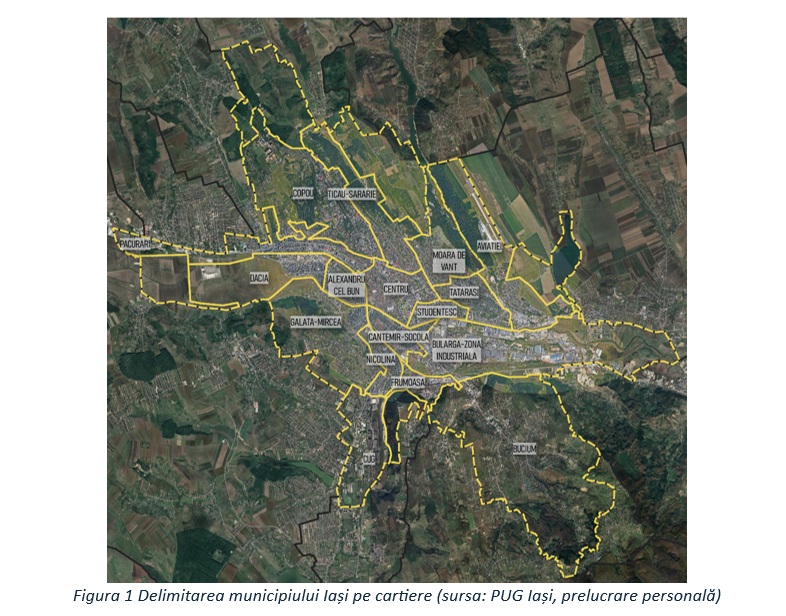 Figura 1 Delimitarea municipiului Iași pe cartiere (sursa: PUG Iași, prelucrare personală)